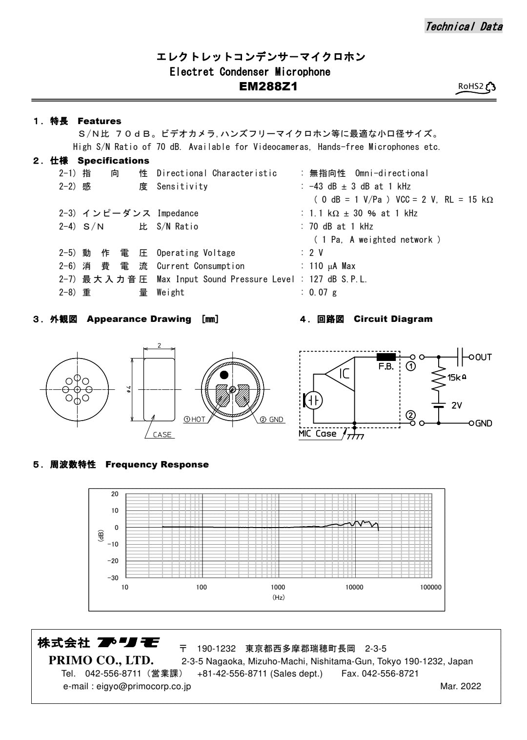 Sensitivity : -43 dB ± 3 dB at 1 kHz ( 0 dB = 1 V/Pa ) VCC = 2 V, RL = 15 kΩ